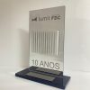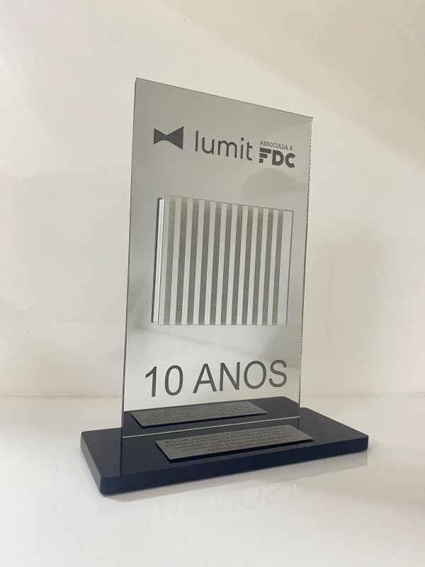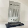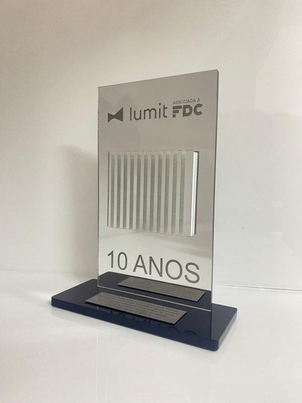 Troféu em acrílico personalizado com alto relevo e placa de alumínio.