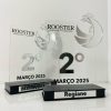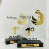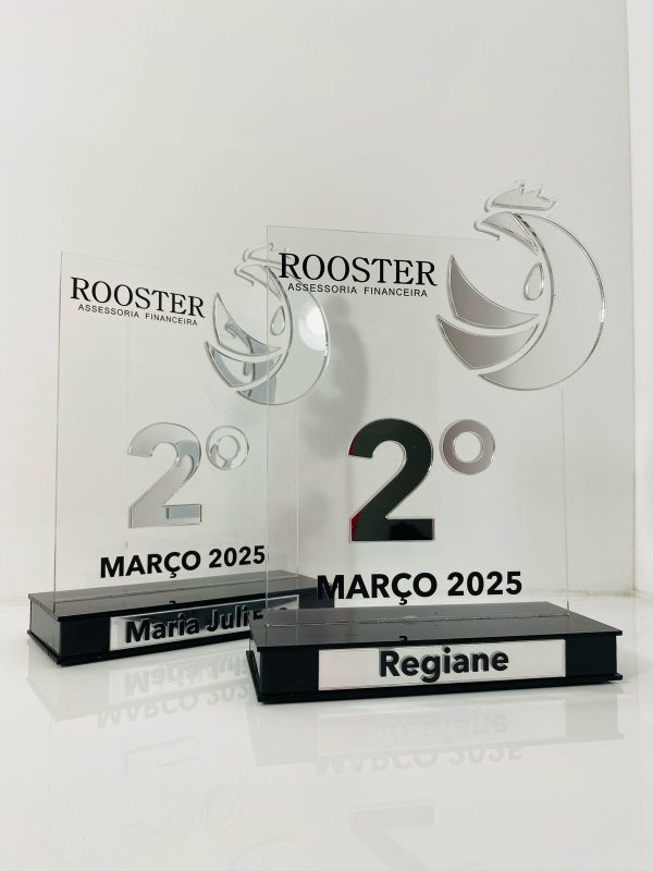 Troféu personalizado feito em acrílico cristal com detalhes de relevo em acrílico espelhado e impressão UV.