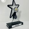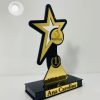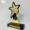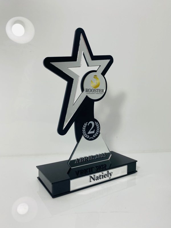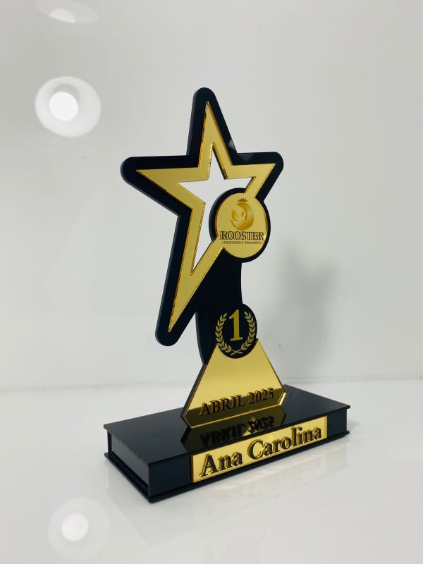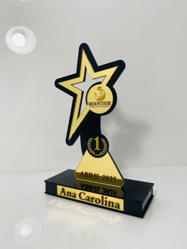 Troféu personalizado em MDF com impressão UV e detalhes em acrílico espelhado.